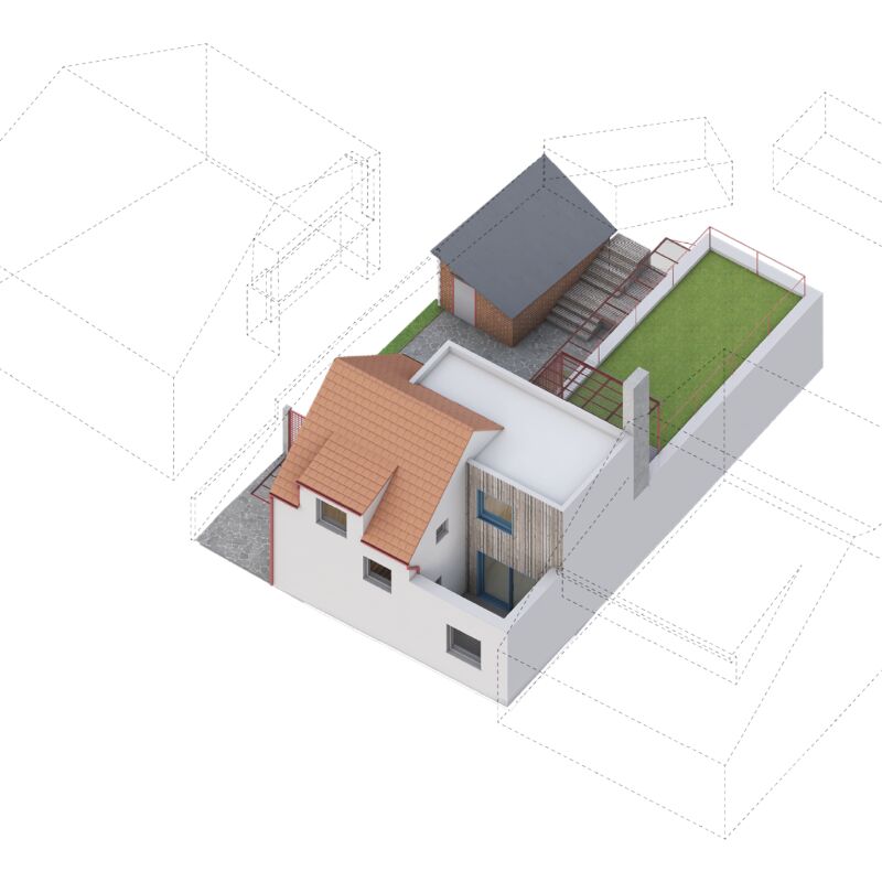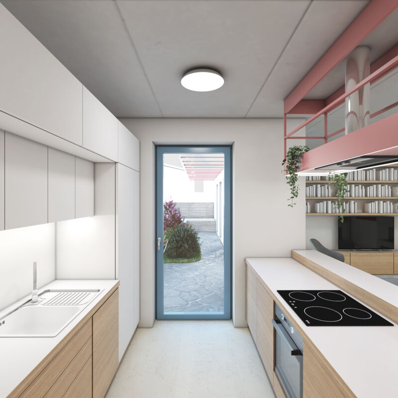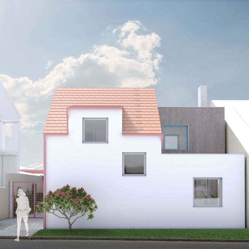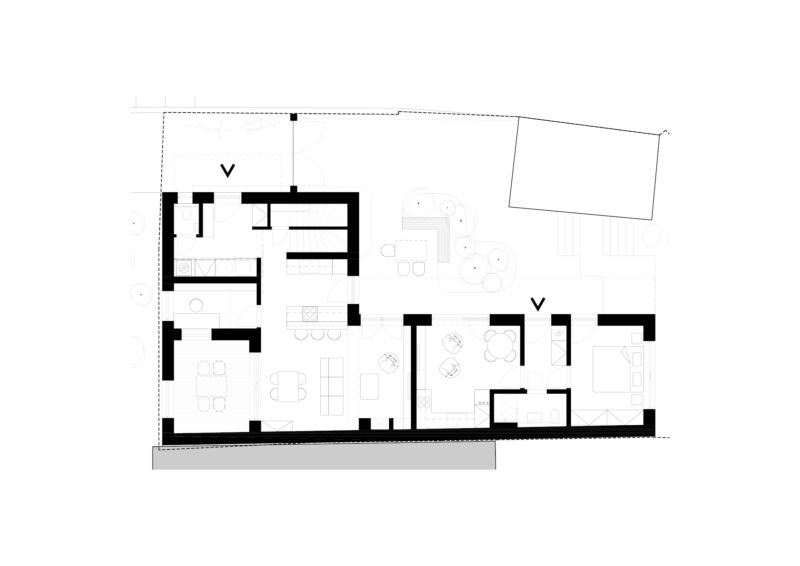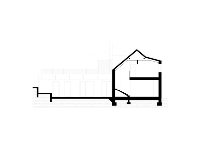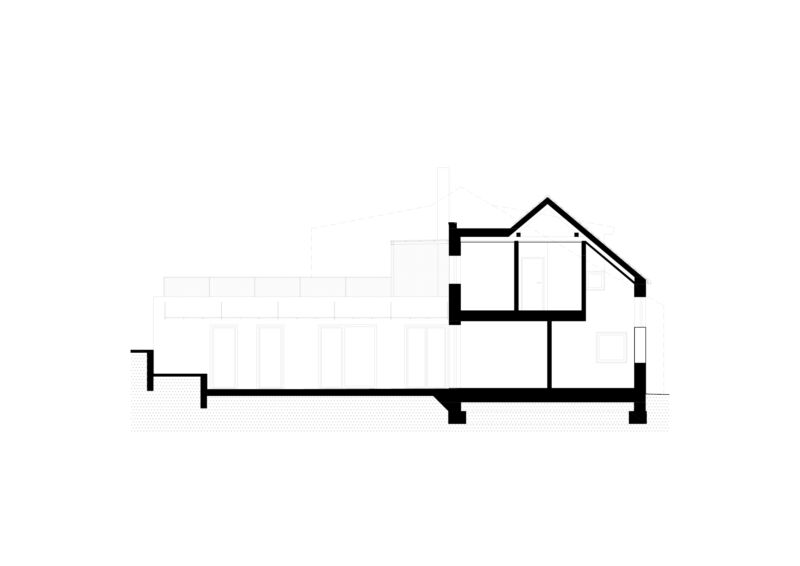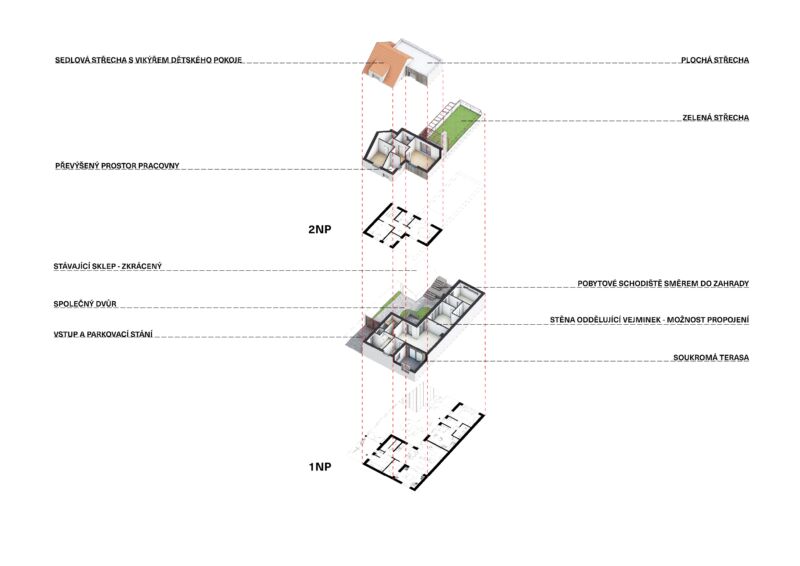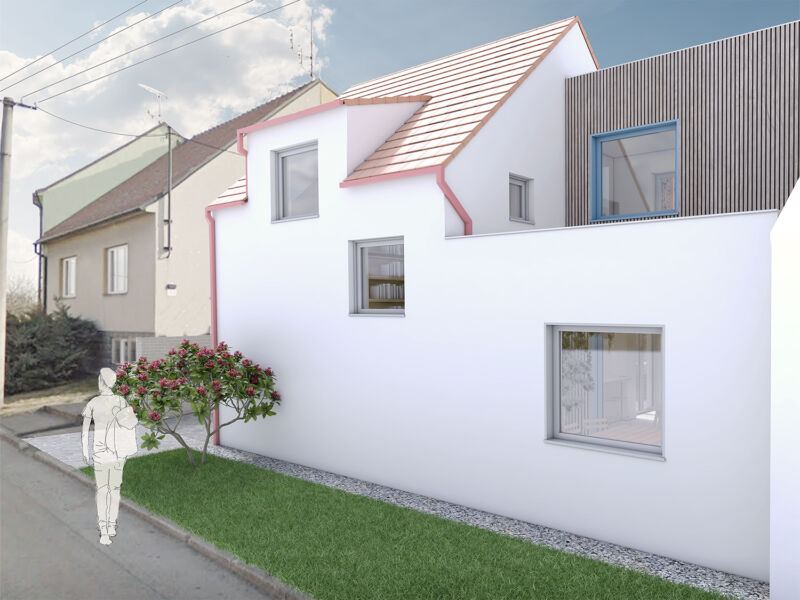Vytvořili jsme společný dvorek, na kterém se obě generace mohou setkávat, zároveň jsme jim dopřáli i možnost trávit čas na vlastní oddělené terase. Díky nové dispozici je celý dům prosvětlený a dodává oběma domácnostem dostatek soukromí. Vejminek, nyní určený pro rodiče klientů, je v budoucnu možné snadno napojit na hlavní obytný prostor a celý dům tak propojit.