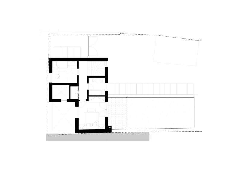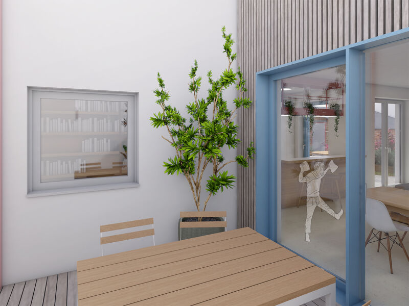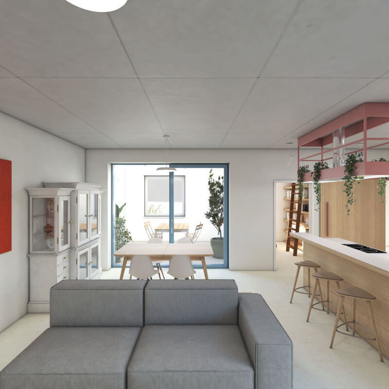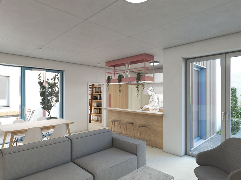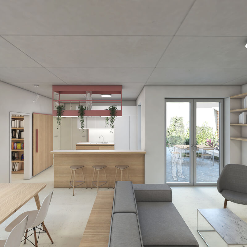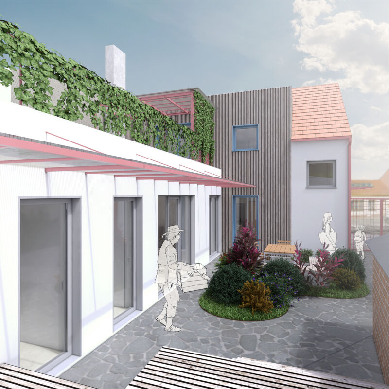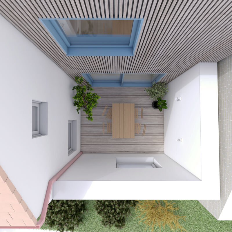 Vytvořili jsme společný dvorek, na kterém se obě generace mohou setkávat, zároveň jsme jim dopřáli i možnost trávit čas na vlastní oddělené terase. Díky nové dispozici je celý dům prosvětlený a dodává oběma domácnostem dostatek soukromí. Vejminek, nyní určený pro rodiče klientů, je v budoucnu možné snadno napojit na hlavní obytný prostor a celý dům tak propojit.
