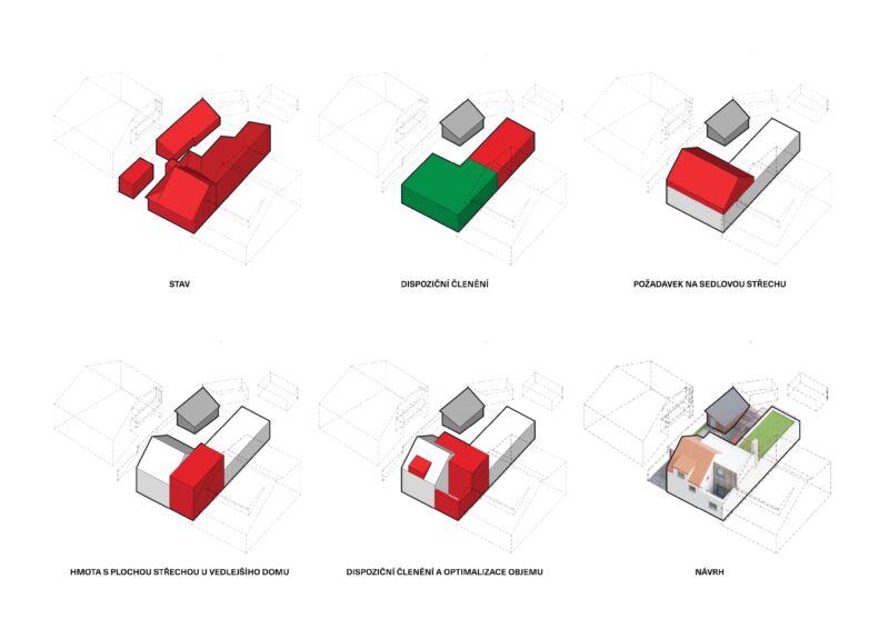 Než majitelé viděli první návrh, jejich představy se držely dispozičního řešení původního domku. Ty rázem padly, když jsme se sešli nad prvními skicami. Díky nim totiž získali nový pohled na to, co je na jejich pozemku vůbec možné. Rychle jsme dali dohromady dispoziční řešení nové stavby a začali ladit interiér. Nejcennější zpětná vazba pro nás je, když návrh přesně odráží přání a potřeby, které měli majitelé v hlavě, přitom je nedokázali pojmenovat nebo zhmotnit… Zkrátka když nad nimi říkají: „To je přesně, co jsme chtěli, přitom jsme o tom ani nevěděli.“