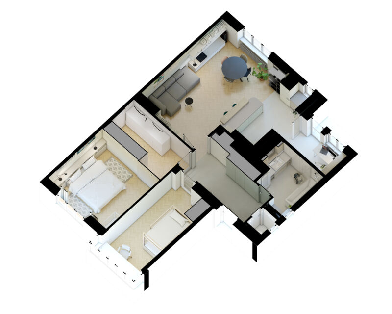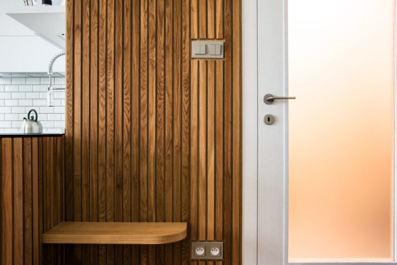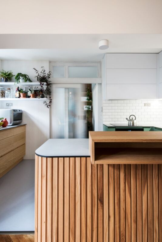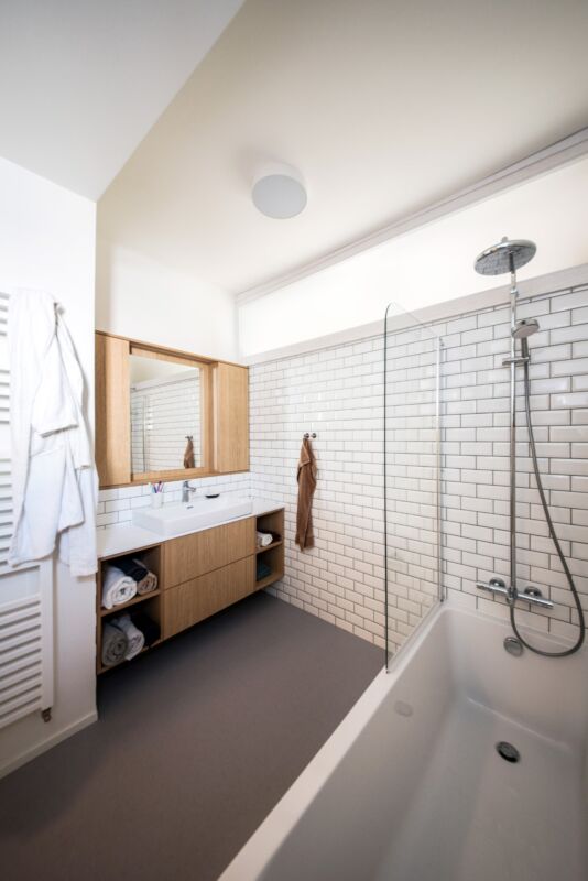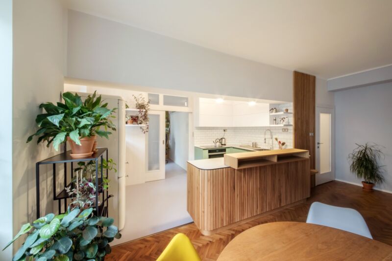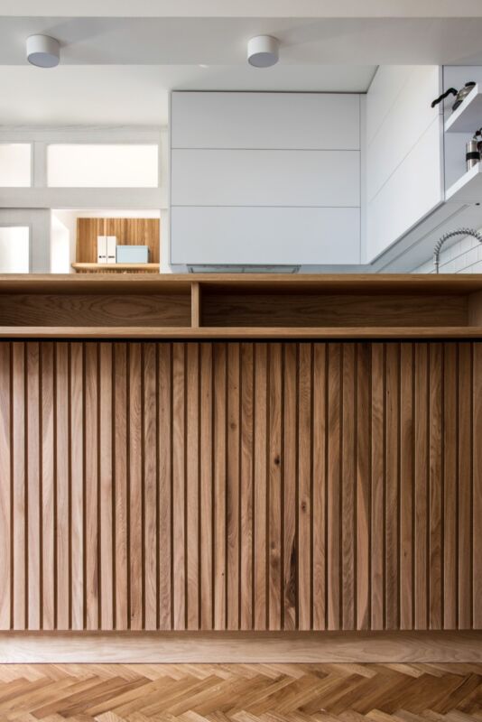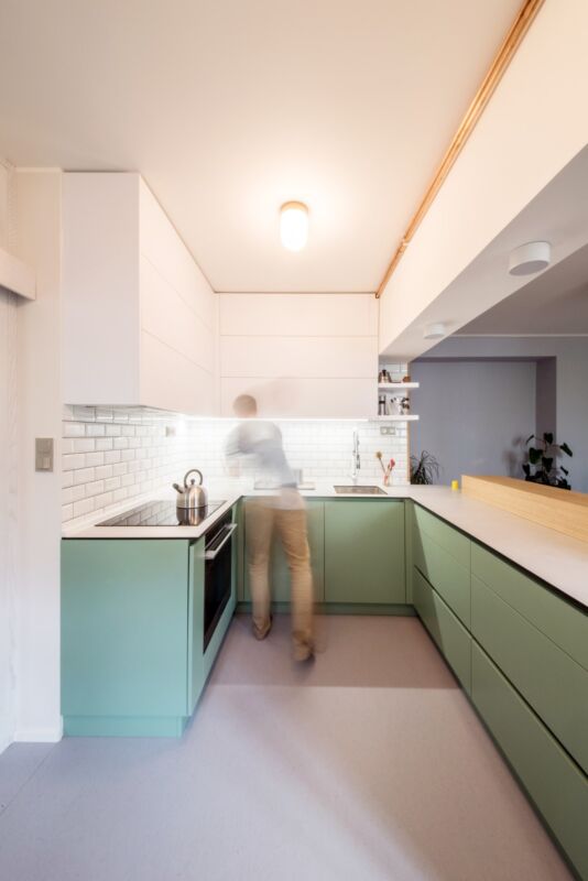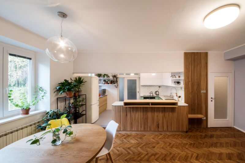 Jediný striktní požadavek od našich klientů bylo využití jemného zeleného tónu, který jsme propašovali na nejrůznější místa v bytě od chodby až po kuchyňskou linku. Nikde ale zároveň není „na sílu“ a doplňuje dubové dřevo v přírodní povrchové úpravě. Spojili jsme prostor obyváku a kuchyně, všude dostali nečekaně hodně světla. A i to okno jsme do koupelny nakonec dostali!